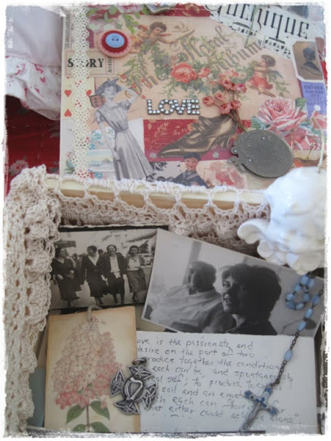 algunas, no todas, sabran que perdi a mi mami a principios del ano 2010. la cuide. aproveche cada minuto con ella en esos ultimos meses. y por eso, invitada por marcela a dejar florecer la imaginacion y porque se apronta el dia de la madre, me puse a hacerle un pequeno baul del recuerdo con las poquitas cosas de mi mami que quise quedarme. todo lo demas se regalo en chile, o fue a la casa de veraneo de mi hermano en puerto varas. le dedique muchas horas a esta cajita y, creanme, fue una especie de meditacion sobre mi mami, escuche su voz clarita (de la cual aun guardo un mensaje en mi celular) y me acorde de sus dones culinarios, su elegancia, su certeza en dar consejos, sus infinitos cuentos.... porque por dios que vivio la mujer.
